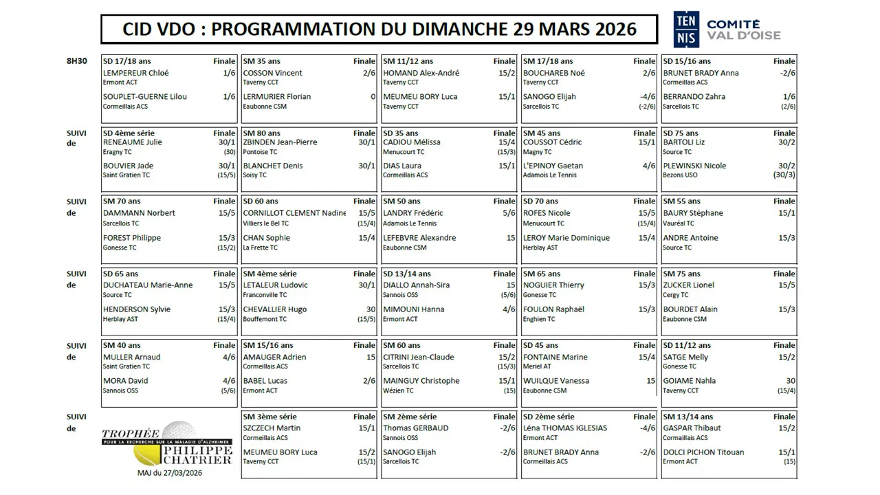 AccueilActualitésProgrammation prévisionnelle - championnat individuel Val d'Oise, dimanche 29 marsProgrammation prévisionnelle - championnat individuel Val d'Oise, dimanche 29 marsArticleTennis26 mars 2026Agrandir l'imageDimanche 29 mars dès 8h30, 30 finales - restauration possible sur placeTELECHARGERSur le même sujetTennis, pratiques associées & Écoresponsabilité : une matinée d’engagements concrets pour faire sa partArticleTennisTennis, pratiques associées & Écoresponsabilité : une matinée d’engagements concrets pour faire sa part26 mars 2026Développer les pratiques scolaires : une dynamique renforcée par les initiatives régionalesArticleTennisDévelopper les pratiques scolaires : une dynamique renforcée par les initiatives régionales5 mars 2026Finales des championnats Val d'Oise - 29 mars 2026ArticleTennisFinales des championnats Val d'Oise - 29 mars 202611 février 2026Voir tous les articles