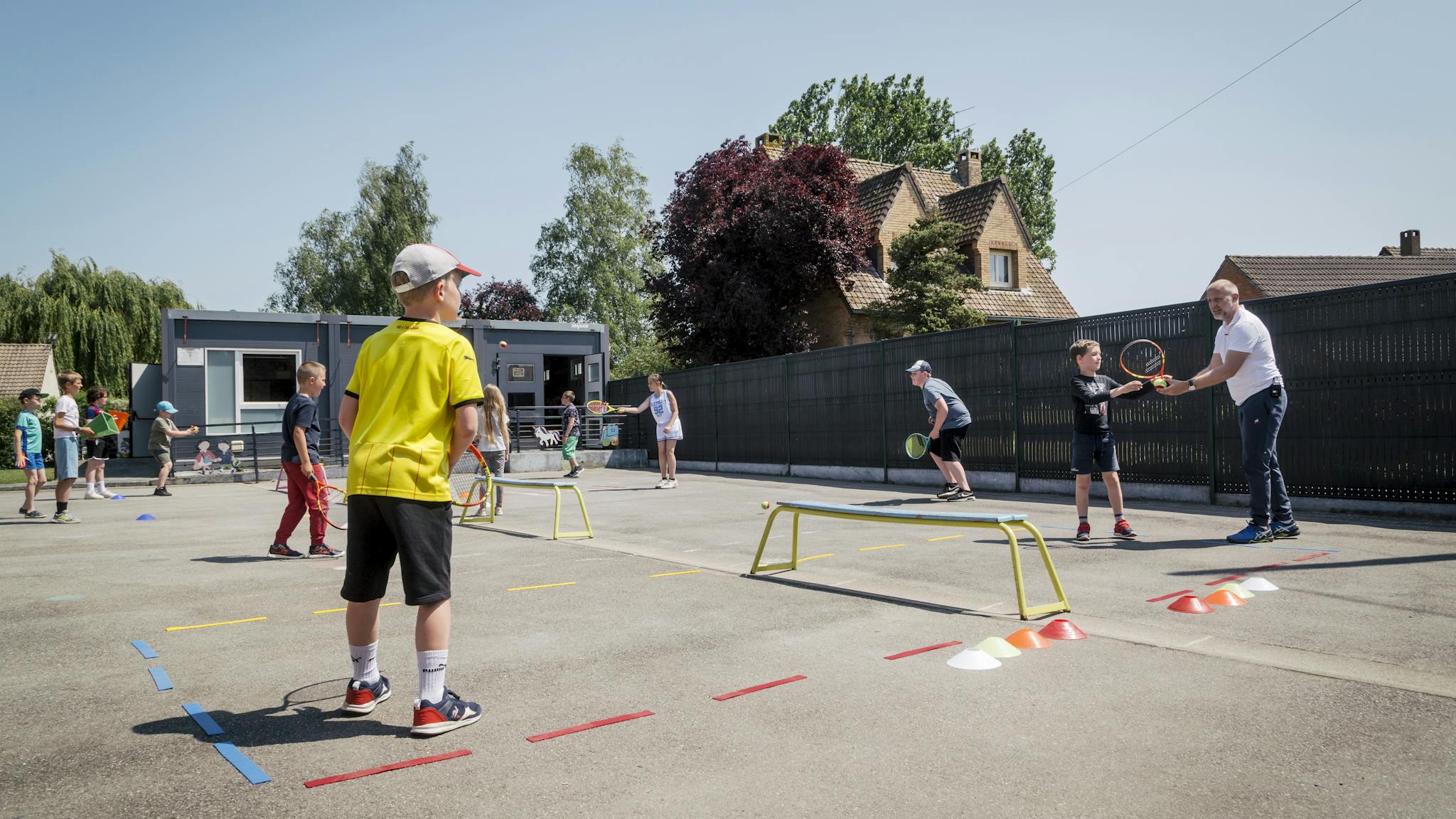 Jeunes élèves jouant au tennis dans la cour de récréation avec leur instituteur